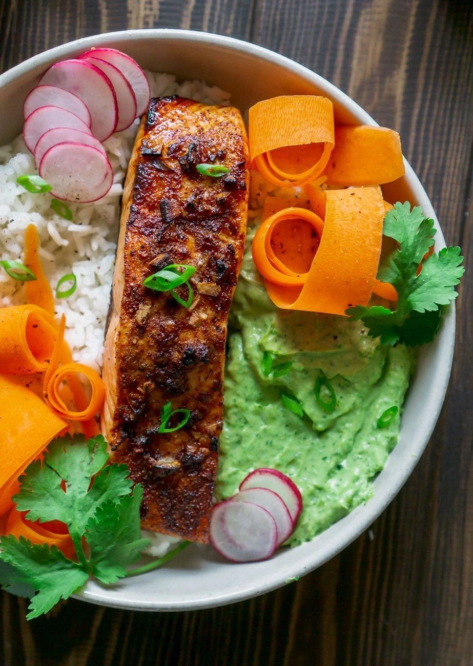 - Assemble the bowls. Start with a bed of jasmine rice, then layer the blackened salmon on top. Arrange the sautéed carrots, radishes, and green onions around the fish. Slice the avocado into wedges and place them in a separate section of the bowl to prevent them from getting soggy. Drizzle 1/3 cup Greek yogurt mixed with a splash of water and a pinch of salt over the top, then sprinkle the wasabi pea mixture. Finish with a squeeze of fresh lemon juice for a bright finish.